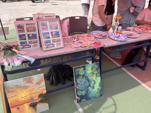 在设计与传播学院的展区,志愿者们以饱满的热情,向观展师生们详细讲述每件作品的创作理念与工艺细节。展出的作品兼具艺术性与实践性,是艺术与技术完美融合的结晶。中国传统工艺美术品油纸伞,以其精湛工艺完整呈现非遗技艺的传承与创新,让观众领略实用功能与东方美学的融合魅力;书法作品则凭借稳健笔画与巧妙留白,传递出独特的东方美学意境。此外,环保文创等现代作品也精彩亮相,彰显学院学子将专业技能转化为劳动实践的创新能力。