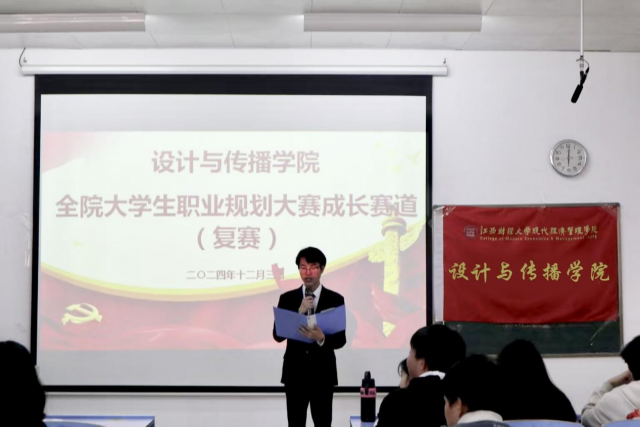 为进一步加强我院的职业生涯教育和就业指导工作,促进高质量充分就业,设计与传播学院于12月3日下午在求真教学楼2304举办了第二届“追梦”大学生职业生涯规划大赛成长赛道复赛。本次比赛邀请了设计与传播学院党总支书记李旸、党总支副书记戴采菱、团总支书记刘威及产品设计学生创新工作室负责人李天凯担任评委。