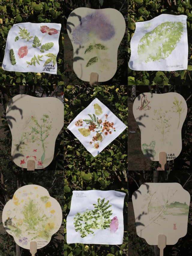活动中,同学们在领取了植物叶片、锤子、白布、扇子等材料后,便开始了动手实践。他们将植物叶片上多余的水分和浮土擦干,放在布料仔细铺好,再轻轻按压,拿起小锤子一点一点敲击,让植物叶片的原汁一点点渗透到布料上,将植物的色彩和形状印染在上面。制作过程中,大家相互交流,互相帮助,探讨植物拓染的技巧和艺术,创造出属于自己的拓染作品。有的设计出了精美的花鸟图案,有的则将自然元素与现代设计相结合,展现出独特的风格。活动现场气氛热烈,大家在活动中感受到了传统非遗文化的魅力。