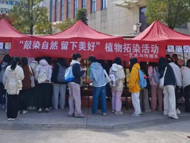 为弘扬中华传统非遗文化,帮助学生树立正确的审美观,提升学生的劳动意识,培养健康的审美情趣。11月20日,艺术与传播系于五味斋食堂前开展“敲染自然 留下美好”植物拓染活动。艺术与传播系党总支书记李旸、党总支副书记戴采菱、团总支负责人刘威出席了本次活动。