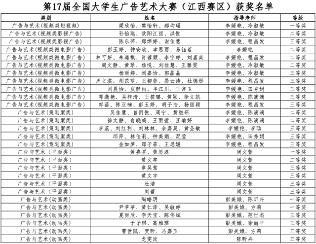 ​近日,17届全国大学生广告艺术大赛(简称“大广赛”)获奖名单正式公布在本次大赛中,设计与传播学院学子再创佳绩,共获得奖项30项,涉及短视频类、微电影类、动画类、策划类和平面类广告,其中国家级三等奖2省级一等奖4项、二等奖7项、三等奖17项。